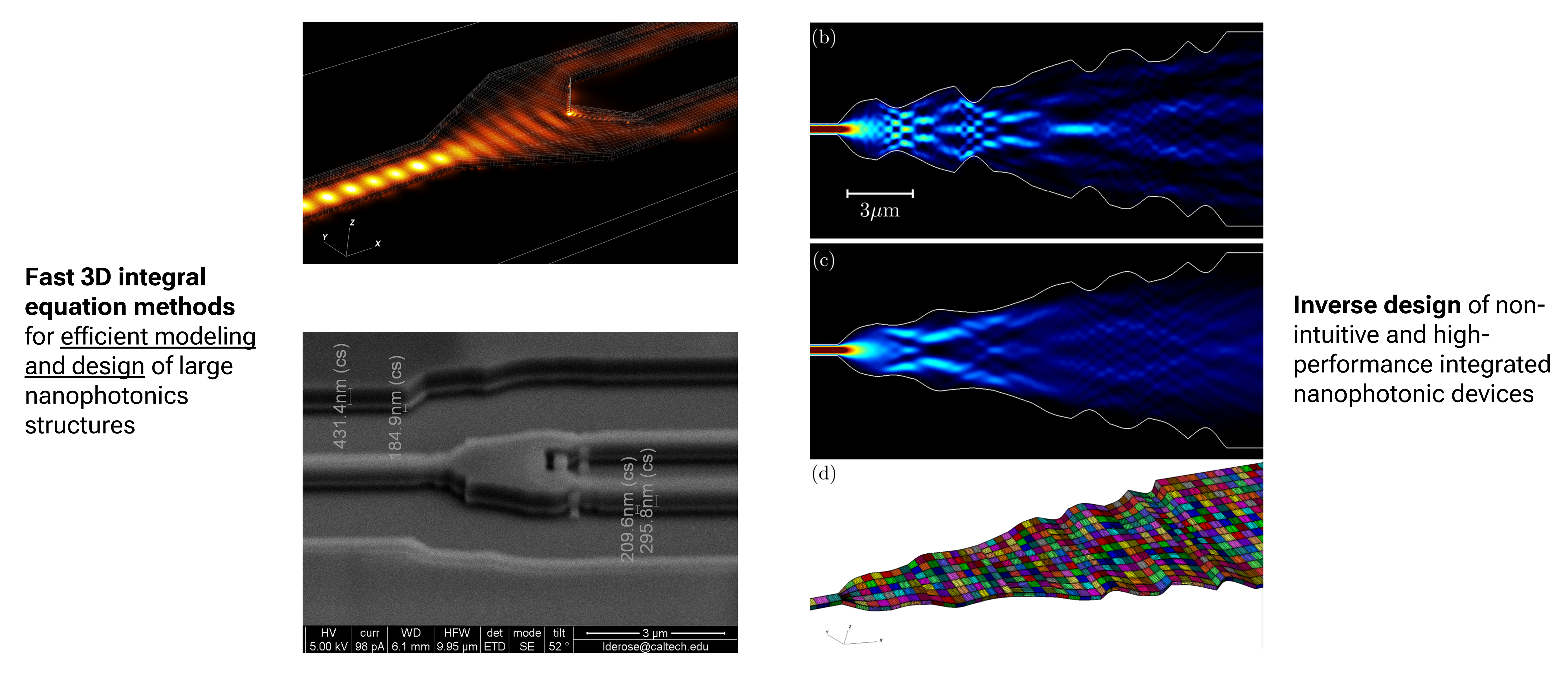 Unfortunately, modeling and designing new SP devices can be quite challenging due to the fact that they often span many wavelengths while having distinct feature sizes smaller than an individual wavelength. This makes lumped-model and ray-tracing approximations inaccurate and the full-wave Maxwell’s equations must be numerically solved for determining the behavior and performance of a device. We are interested in developing new computational approaches for efficiently and accurately modeling SP devices and systems and furthermore coupling them with optimization algorithms to automatically design new, cutting-edge devices only given a high-level goal performance specification and without any human intervention.